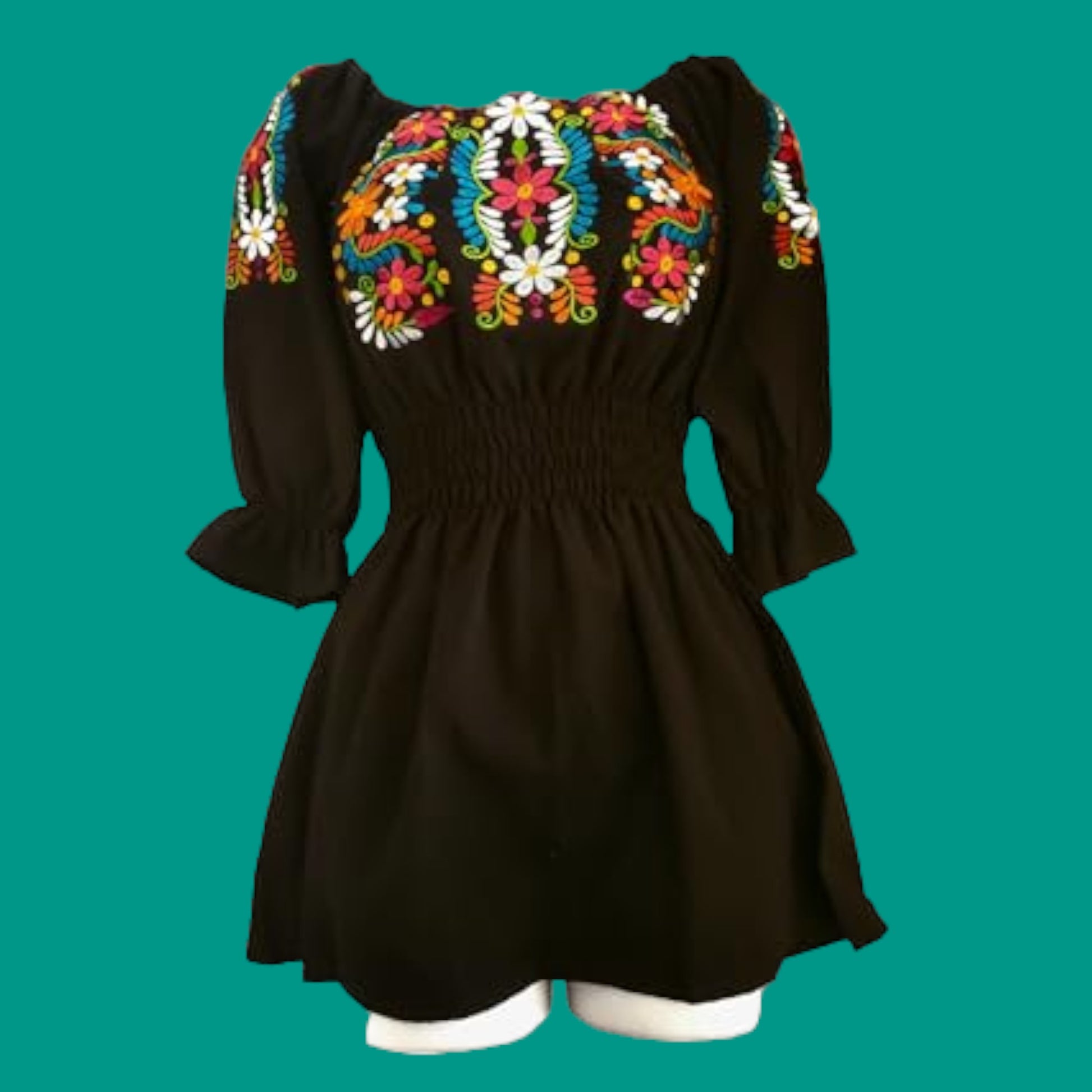 Mexican Embroidered Blouse, Off The Shoulder Blouse, Black Artisanal Mexican Blouse, Floral Mexican 3/4 sleeve